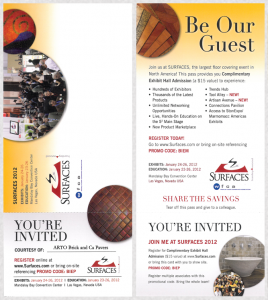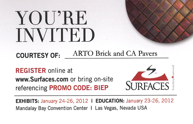 Be our guest at Surfaces 2012 in Fabulous Las Vegas January 24-26. ARTO will be displaying a huge 10×20 booth featuring ARTO’s signature rustic concrete and clay tiles. We will also be introducing Studio, hand painted cuerda seca tiles. Visit Surfaces.com, register and use the Promo Code: BIEP. If you don’t gamble you may come out ahead.