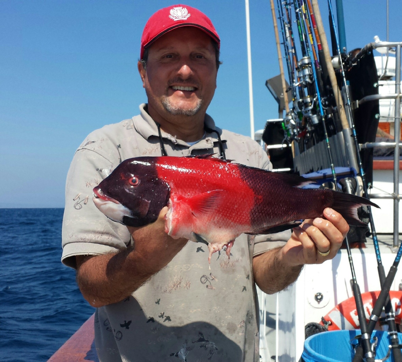 This first picture is of George our sealer vendor . He was pleased to pick up this sheepshead aka Semicossyphus pulcher . He was very excited because he had a family recipe ready to go when he got to land.