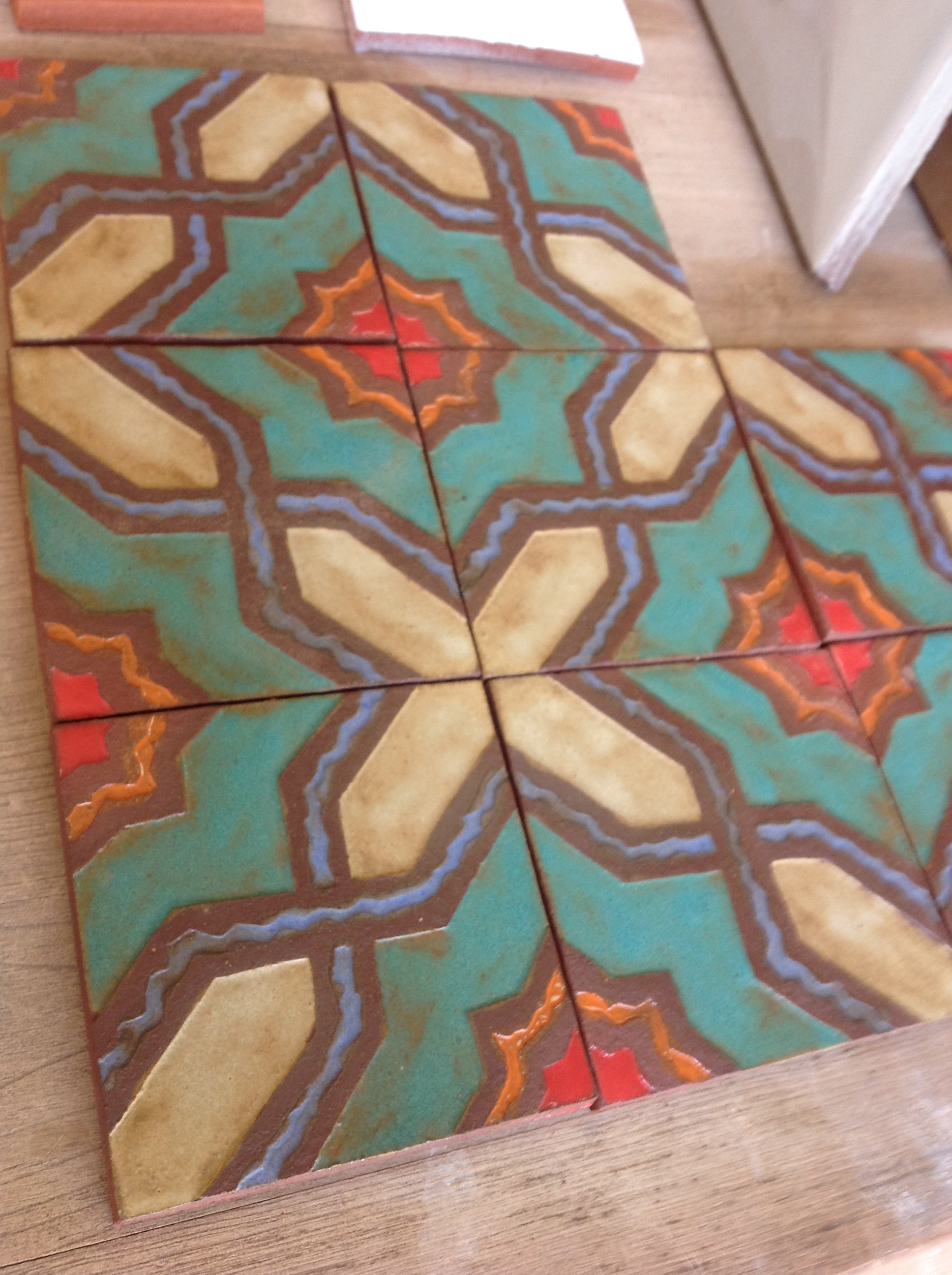 Beto from the Western Quarry factory is working on a project. He produced these wonderful Low Relief Handmade Glazed Tiles. I am not sure what period they are from or what the romantic name is for them but they are good looking. The ones shown are glazed & fired with the Western Quarry Color Ways in a Gas Kiln at cone 4. They have that feel when you hold one.