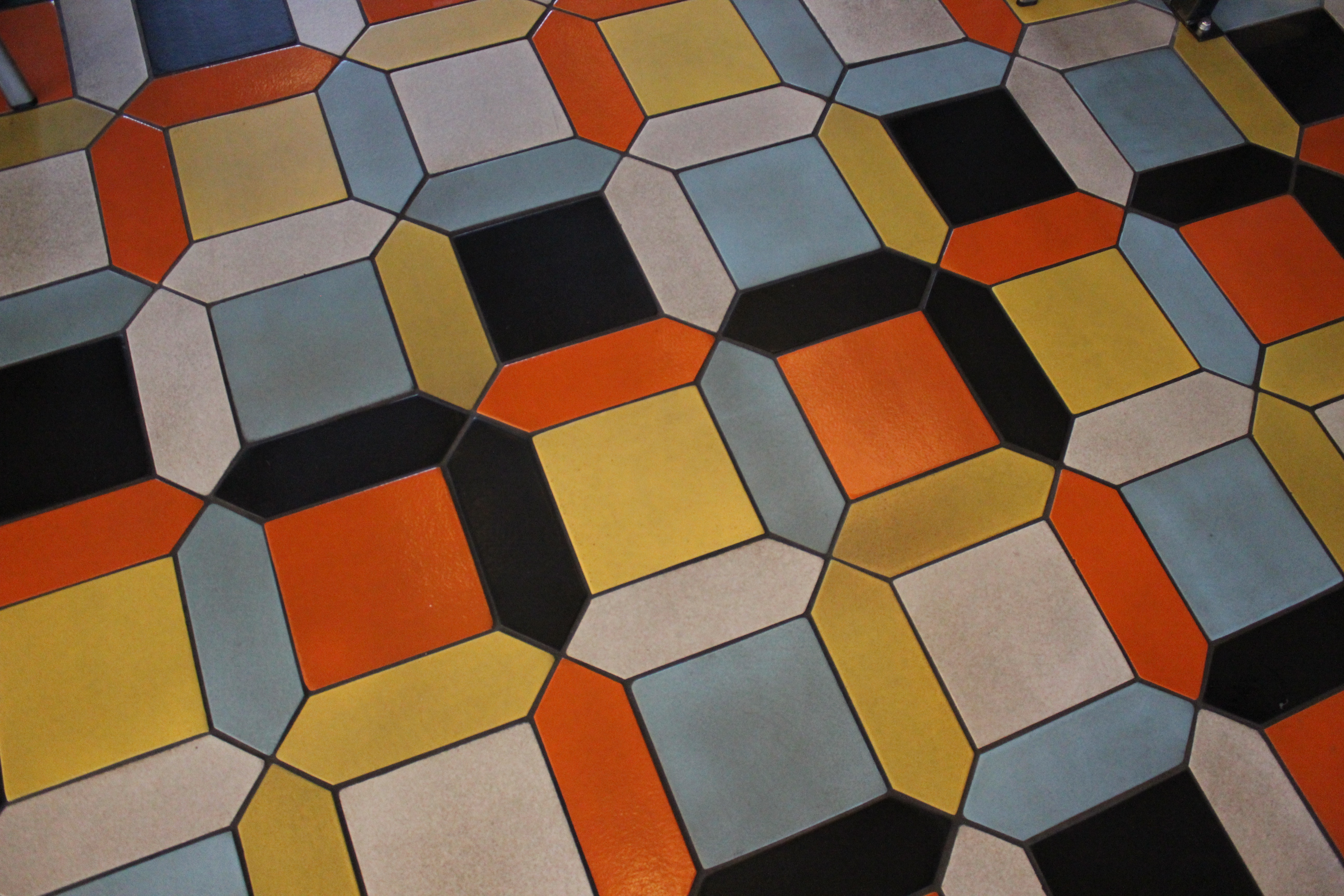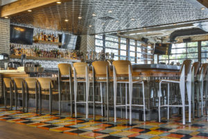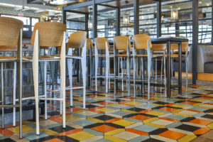 Our unglazed ceramic and high fired glazed tiles have all been tested and meet DCOF requirements for slip resistance (except for our Hazard County Orange and Apple Valley Red glazes.  However, even these two glazes can be used in wet areas and commercial applications if we add grit (sand) to the glazed surface.  A good example is the Mighty Kitchen restaurant in Los Alamitos shown below.  The designers wanted to use Hazard County Orange in their multi color picket pattern so we added grit to increase the slip resistance.
